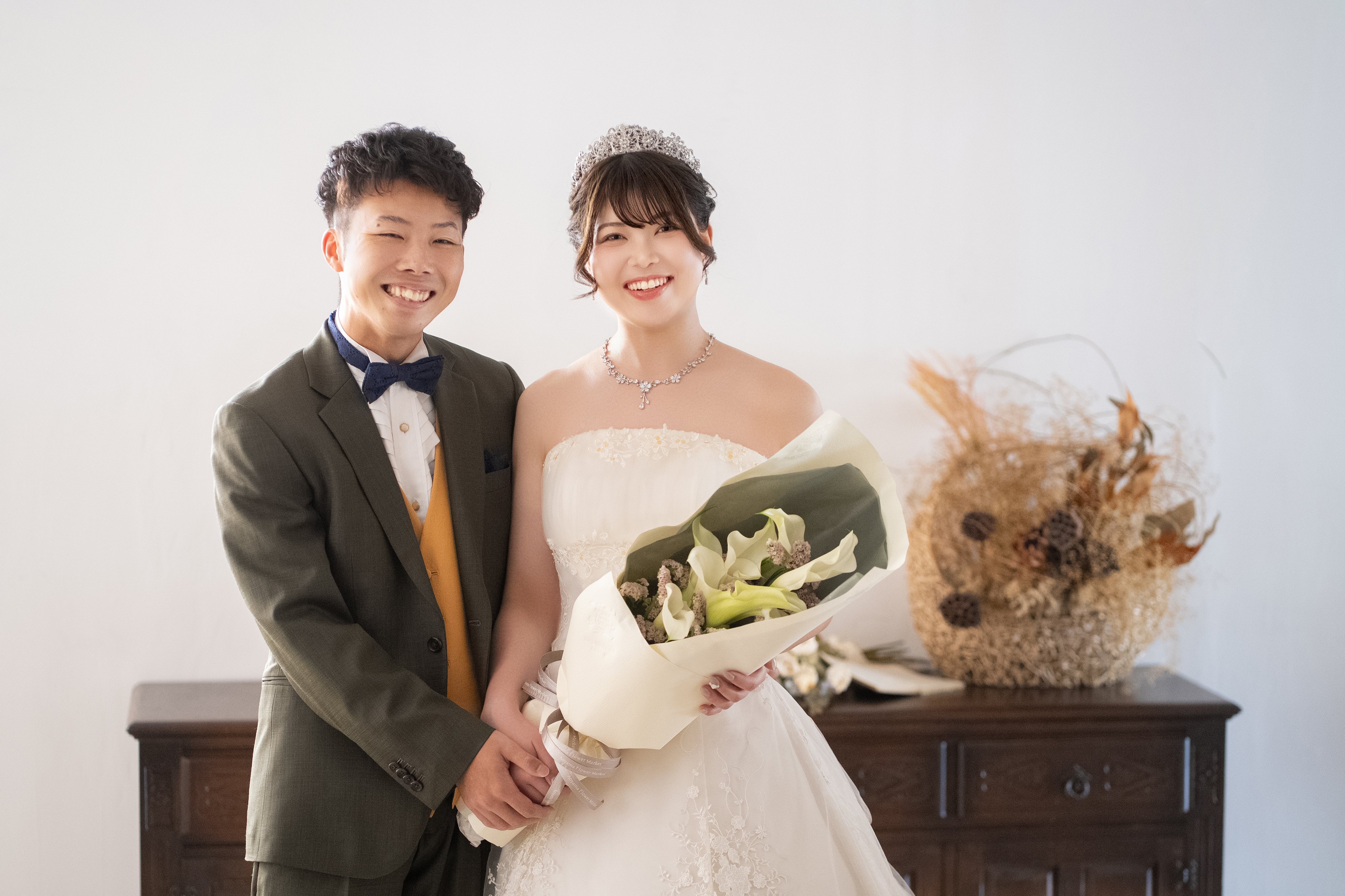 2人の衣裳の色味とぴったりな花束ですね♡